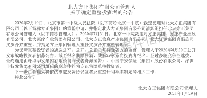 2021年1月29日全国企业破产重整案件信息网公示北大方正集团重整投资者名单。
