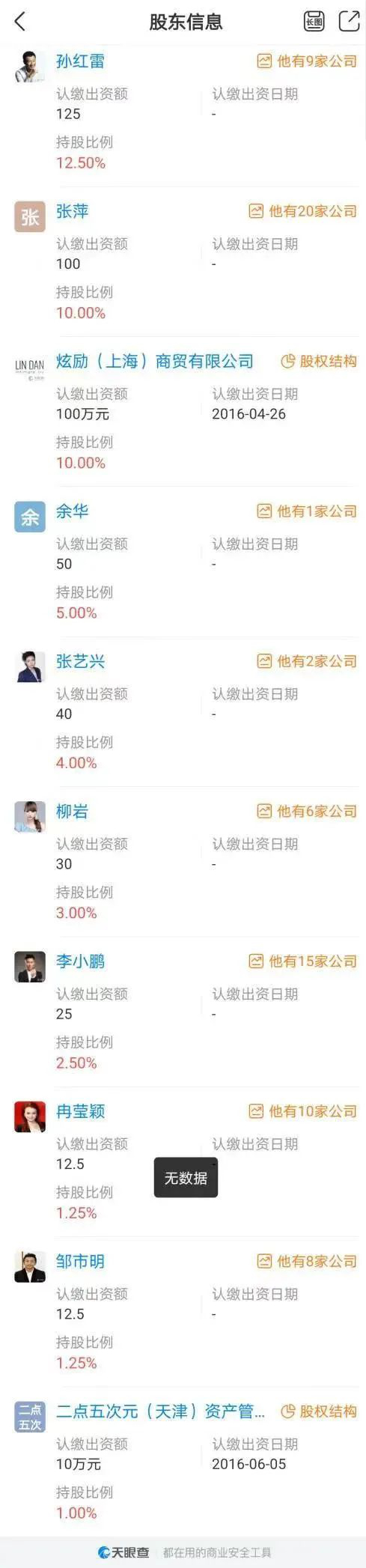 同样是在2015年前后,天眼查数据显示,2019年爆雷的先锋集团,旗下就有一家公司背后涉及到明星股东:新影人。据2015年该公司官微发布消息称,冯小刚、李亚鹏、余华、林丹、潘晓婷五位明星投资人均为新影人股东。此后柳岩、孙红雷、邹市明、张艺兴亦加入新影人股东行列。