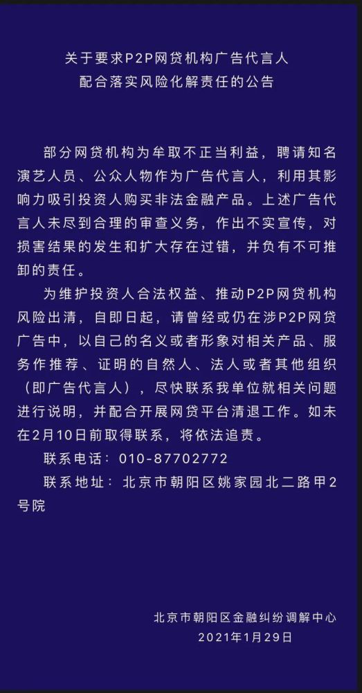 2021年1月29日,北京市朝阳区金融纠纷调解中心发布了关于要求P2P网贷机构广告代言人配合落实风险化解责任的公告。