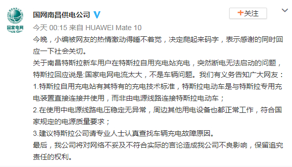 对于特斯拉的“甩锅”,1月31日凌晨,@国网南昌供电公司微博发文称: