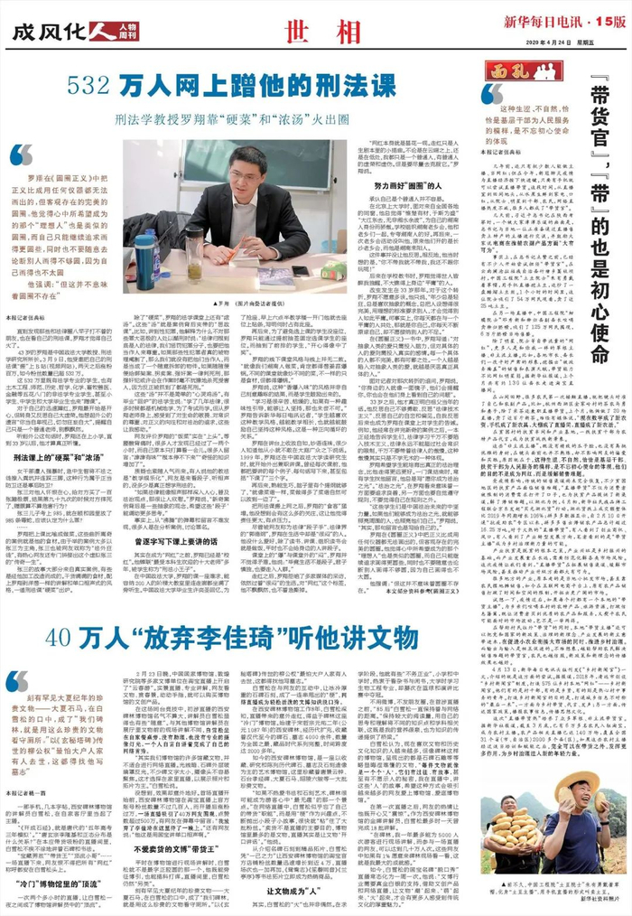 【编者按】1月30日,B站“2020百大UP主”颁奖播出。B站按照综合创作力、影响力、口碑力三个维度,评选出了年度百大UP主、年度新人奖、年度最佳作品等多个单项奖。其中,知识区UP主“罗翔说刑法”摘得“年度最高人气”奖。去年4月,《新华每日电讯》曾写过一篇关于罗翔的人物报道,今日重发此文,或许有助于理解他为何如此受欢迎——