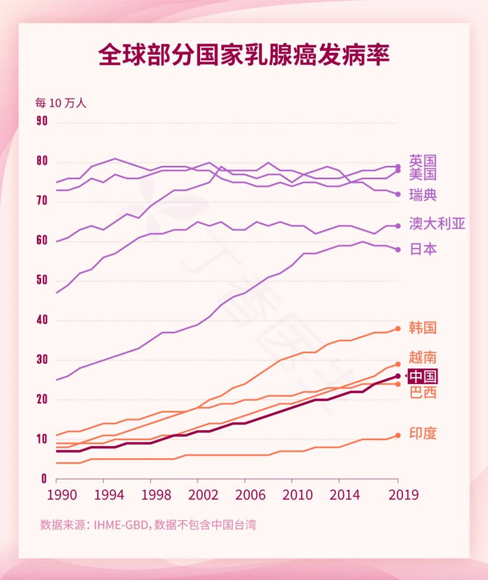 发达国家,例如英国、美国、瑞典等,乳腺癌的发病率普遍较高,它们的快速增长主要发生在 1980 到 2000 年代,目前进入了「稳定状态」。