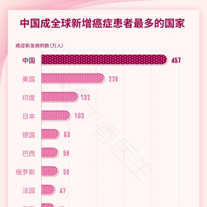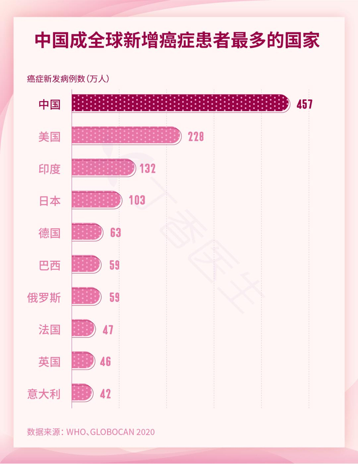 数据显示,2020 年,预测全球新增癌症人数共计 1,929 万人。其中,中国以 23.7% 的占比,成为全球癌症新增人数最多的国家。
