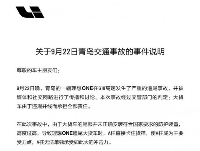 2020年9月22日晚,青岛的一辆理想ONE在G18高速公路追尾一辆大货车,理想ONE的A柱严重变形,车内人员严重受伤。此次事故车主质疑安全气囊没有及时打开,辅助驾驶并未进行干预等问题。理想汽车在官方声明中表示,在此次事故中,是大货车的尾部并未正确安装符合国家要求的防护装置所致,并表示L2 级别辅助驾驶存在局限性,无法识别旁边车道上车辆变入主车道,没法在旁边车道车辆并入 1/5 车身的时候识别成主要目标。