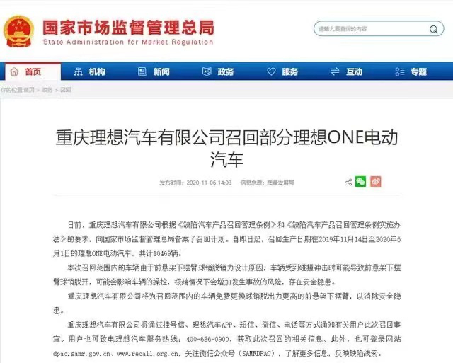 11月6日,据国家市场监督管理总局官网通告,重庆理想汽车有限公司根据《缺陷汽车产品召回管理条例》和《缺陷汽车产品召回管理条例实施办法》的要求,向国家市场监督管理总局备案了召回计划。
