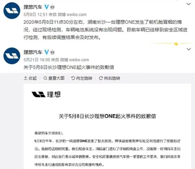 2020年5月8日,长沙街头一辆理想ONE起火,车辆前机舱部分烧损严重,这是理想品牌的首次“起火自燃”事故。官方的致歉声明显示,此次自燃事故与增程器、电池包、油路都没有关系,导致自燃的“罪魁祸首”竟然是一块遗落在前机舱内的车漆防护垫。仅5月一个月,理想汽车就爆出了四起事故,包括高速路上刹车失灵、车辆“断轴”和暴雨中车内漏水。