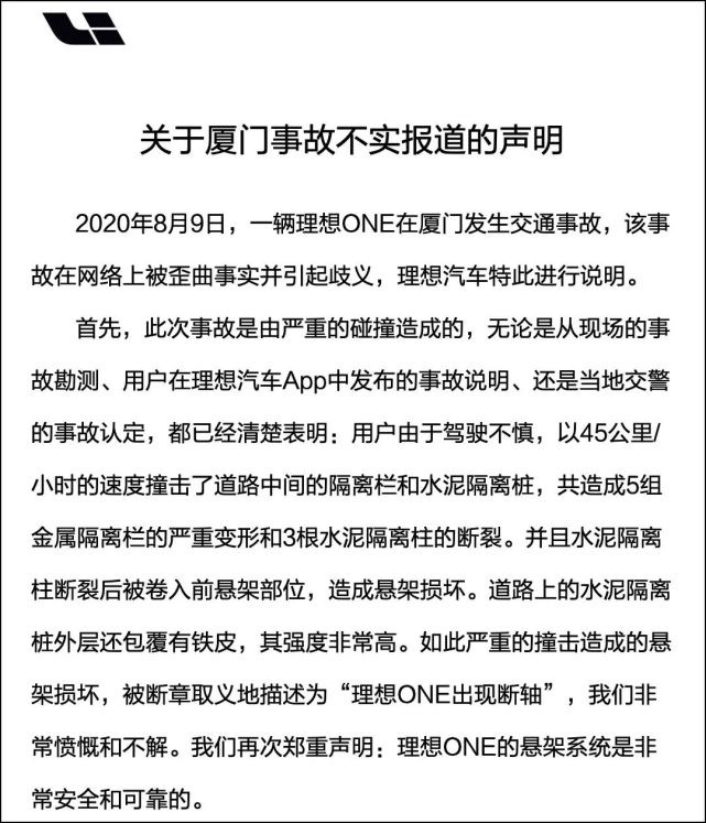 8月9日晚,厦门一辆理想ONE再次发生“断轴”事件。现场车辆左前侧遭遇撞击,左前轮脱落,车辆下方有液体流出。理想汽车官方对此表示,此次事故由于用户驾驶不慎,以45km/h的速度撞击了道路中间的隔离栏和水泥隔离柱,共造成5组金属隔离栏的严重变形和3根水泥隔离柱的断裂,并且水泥隔离柱断裂后被卷入前悬架部位,造成悬架损坏,并称媒体报道的“理想ONE出现断轴”为不实报道。