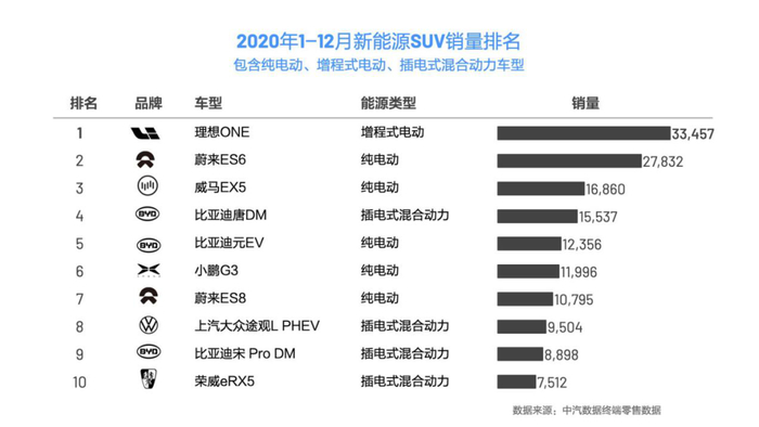 而从中汽数据终端零售数据最新公布的2020年1-12月新能源SUV销量排名中可以看到,15万元-30万元的车型上榜率最高,威马EX5、比亚迪唐DM、荣威ERX5、小鹏G3、比亚迪宋Pro DM、上汽大众途观L PHEV指导价均在这个区间,理想ONE在售价上的优势也并不明显。