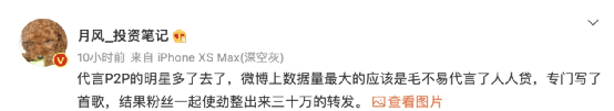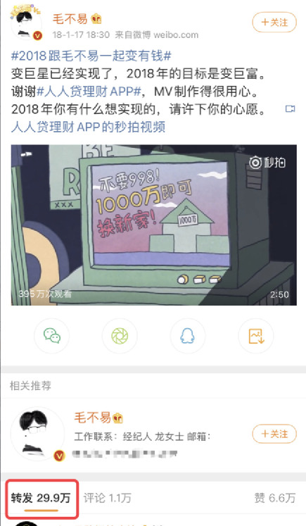 明星对P2P平台的引流作用不可忽视。有财经大V表示,“代言P2P的明星多了去了,微博上数据量最大的应该是毛不易代言了人人贷,专门写了首歌,结果粉丝一起使劲整出来三十万的转发。”
