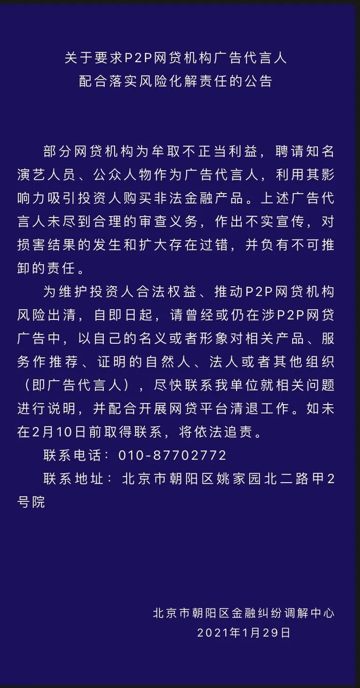 2021年1月29日,北京市朝阳区金融纠纷调解中心发布了关于要求P2P网贷机构广告代言人配合落实风险化解责任的公告。