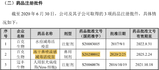 此外,百克生物进行特定药品生产还必须从国家药品监督管理局(以下简称“国家药监局”)获得药品注册批件。据招股书披露,截至2020年6月末,百克生物及其子公司取得了三项药品注册批件,其中,水痘减毒活疫苗(注射剂)药品批准编号为S20083005,批准日期为2017年9月1日;冻干鼻喷流感减毒活疫苗(鼻用制剂)药品批准文号为S20200002,批准日期为2020年2月25日;人用狂犬病疫苗Vero细胞(注射剂)药品批准文号为S20060076,批准日期为2016年10月19日。