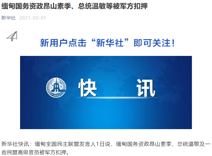 据新华社,缅甸全国民主联盟发言人1日说,缅甸国务资政昂山素季、总统温敏及一些民盟高级官员被军方扣押。路透社报道称,连日来缅甸文职政府与军方之间的紧张关系因军方所称的“选举舞弊”在升级,外界担心该国可能发生“政变”。