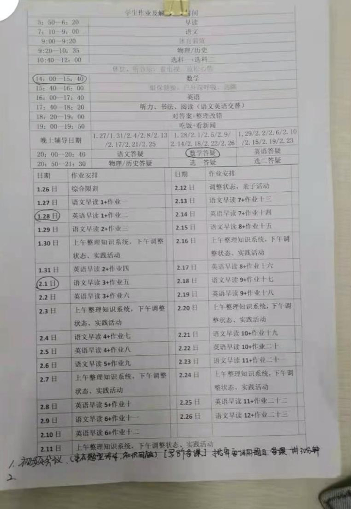 小陈说,第一个阶段是1月13日到1月27日,那会儿学校没有放假,教学进度和作息时间都和在学校一样,从早上5点半起床,一直上到晚上9点五十。