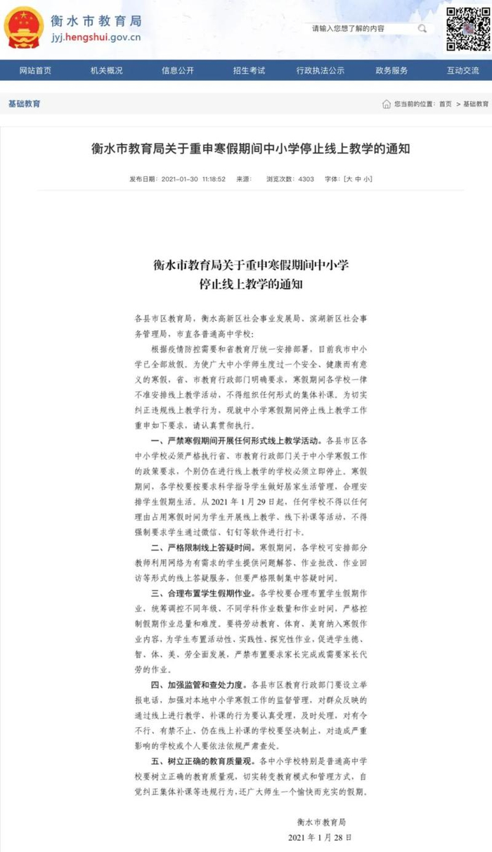 1月30日,衡水市教育局官网发布通知,要求从1月29日起,寒假期间,严禁开展任何形式的线上教学、线下补课活动,不得强制要求学生通过微信、钉钉等软件打卡。同时,要严格限制线上答疑时间,合理布置学生的假期作业。