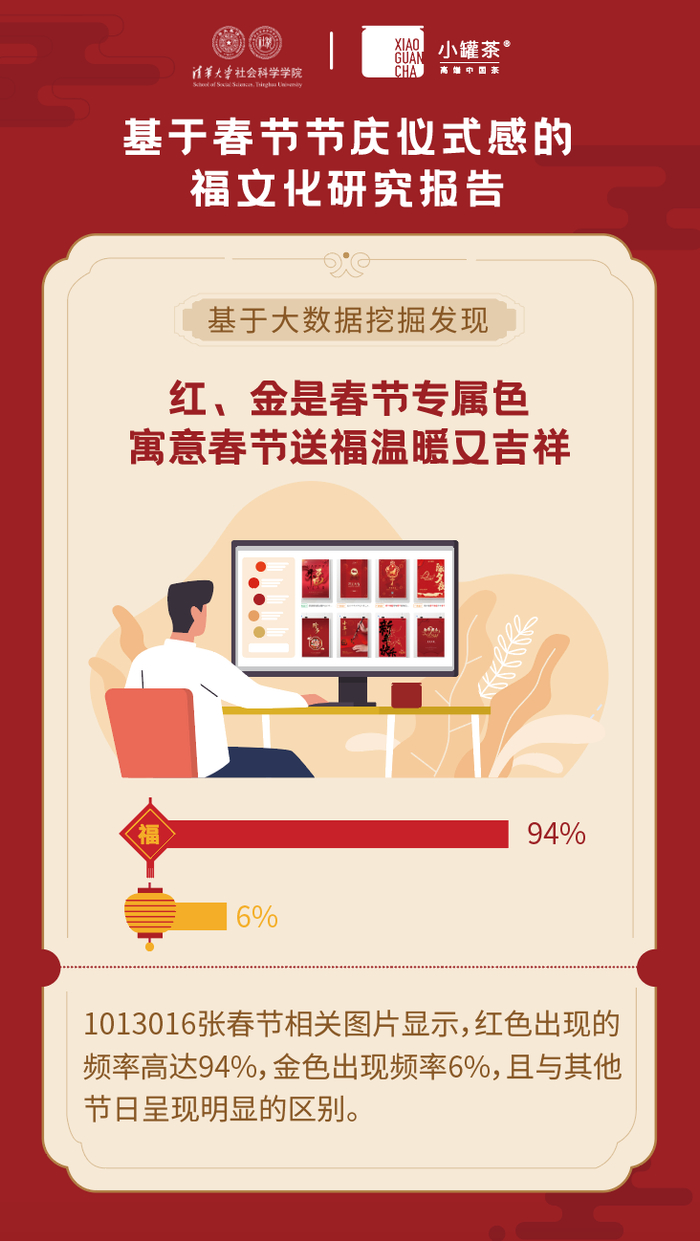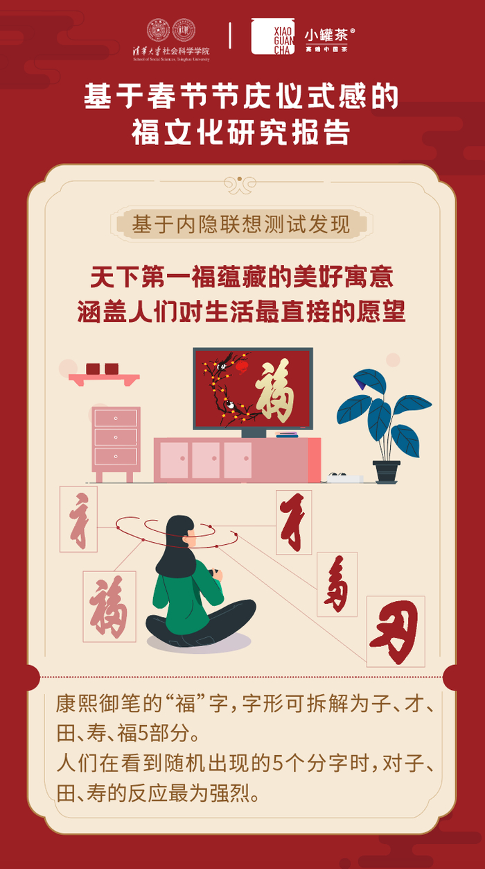 2020年是特殊的一年,人们对福的诉求和期盼空前提升,对平安顺遂的生活更加向往。在这样的时间节点,为了更好的完成所有人的对美好生活追求的心愿,也为了让中华传统文化更加熠熠生辉,小罐茶联合清华大学社会科学学院,共同发布《基于春节节庆仪式感的福文化研究报告》,从挖掘福文化历史及传承路径入手,发现中国福文化与幸福感之间的关联,旨在探寻与“福”有关的文化习俗与中华民族精神内涵之间的关系。