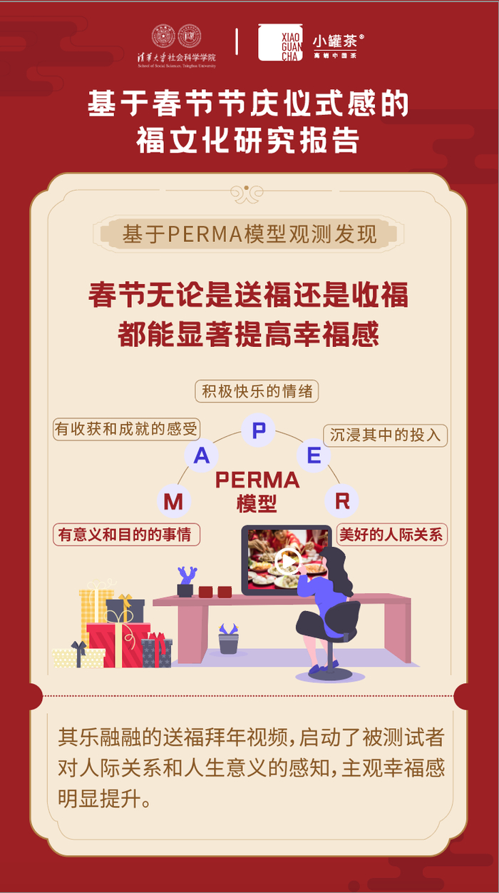 而为研究中国人的幸福观,清华大学利用“PERMA”模型,即量化幸福感的模型做了一组关于“送福”的对照实验,从积极情绪、投入、人际关系、意义、成就五个维度测量被试者的主观幸福感。