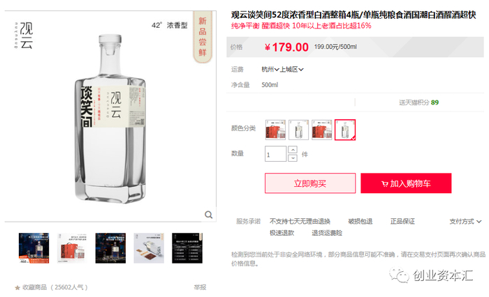 而淘宝旗舰店来看,观云酒的价格也并不贵,比较便宜的179元就能买到一瓶观云谈笑间的500ML白酒,并且数量多的话,还能免费刻字,比如某某生日快乐等比较符合年轻人调性的营销方式。