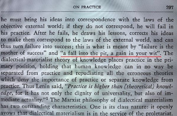 一则是《实践论》中的“吃一堑长一智”,钱锺书马上译为:A fall into the pit, a gain in your wit