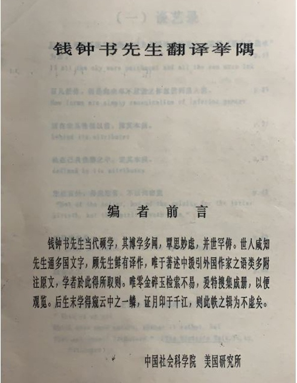 我们在清华又结识了几个中国人。著名的《书林季刊》的钱锺书,在这里的外语系教书,我们已成莫逆。他是我至今所见最自负的人,但也是少有的才子。
