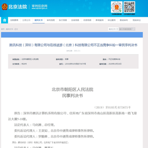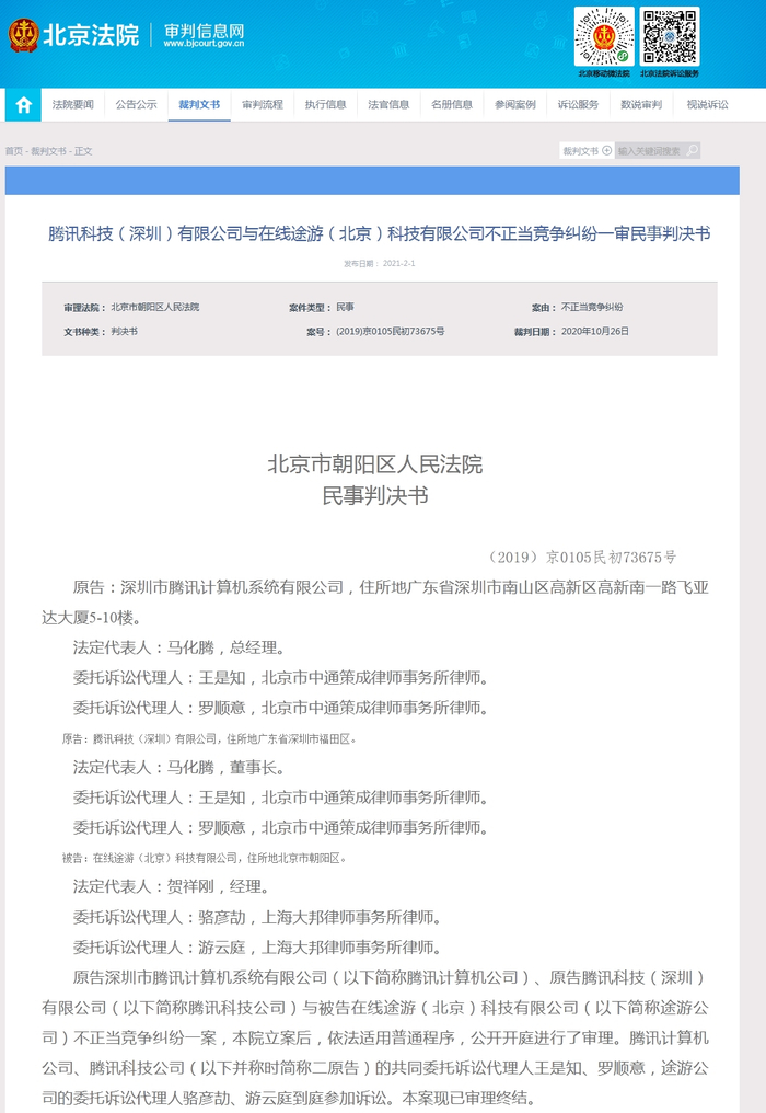 判决书显示,两原告为深圳市腾讯计算机系统有限公司(以下简称腾讯计算机公司)、原告腾讯科技(深圳)有限公司(以下简称腾讯科技公司)。