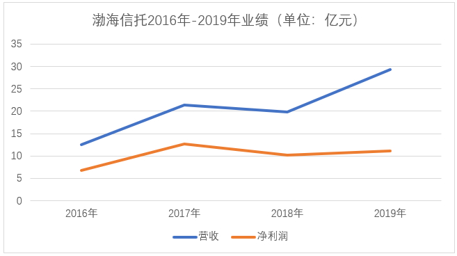 根据渤海信托的年报数据,2016年-2019年,公司营收分别为12.52亿元、21.36亿、19.85亿、29.24亿;净利润分别为6.74亿、12.64亿、10.17亿、11.16亿。