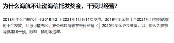 结合渤海信托的业绩,以及近年海航集团欠下的巨额债务,有用户在知乎上发贴爆料称,奖金充公给海航拿去补窟窿了。