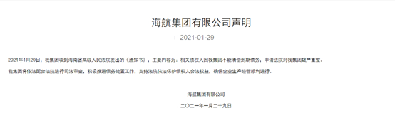 1月29日晚,海航集团发布声明,相关债务人因该集团不能清偿到期债务,申请法院对其破产重整。