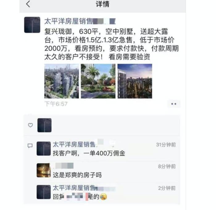 1月22日,一条“市场价值1.5亿元的复兴珑御630平方米的空中别墅,低于市场价格两千万元急售,看房需要验资”的消息出现在上海中介的朋友圈中,随后立即被刷屏,而刷屏的关键信息则是该栋豪宅的主人正是最近遭遇多重风波的郑爽。