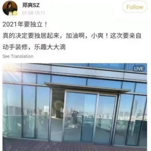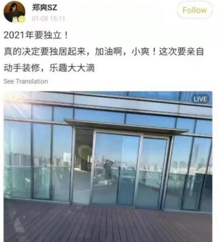 1月8日下午,郑爽豪宅首次曝光,其在社交平台公开表示“2021年要独立!真的决定要独居起来,加油啊,小爽!这次要亲自动手装修,乐趣大大滴”。