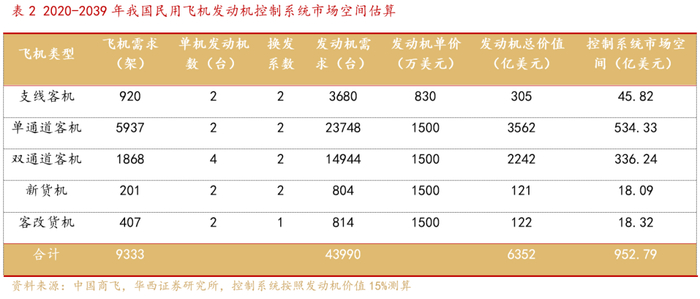 根据中国商飞发布的《2020-2039年民用飞机市场预测年报》,未来20年,中国航空市场将接收50座以上客机8725架,其中,50座级以上涡扇支线客机交付920架,120座级以上单通道喷气客机交付5937架,250座级以上双通道喷气客机交付1868架;未来20年,中国航空市场将接收货机608架,其中,新货机201架,客改货机407架。我们预计,未来20年我国民用飞机发动机控制系统市场空间约为952.79亿美元。