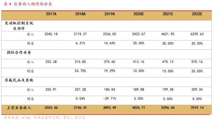 我们对公司业务进行拆分预测:受益于“十四五”期间航空发动机高景气需求,发动机控制系统及部件业务2020-2022年保持35%增速;受新冠疫情影响,2020年国际合作业务增速调低为10%,随着疫情影响逐渐消除,国际合作业务有望持续向好,2021年、2022年增速为15%、20%;公司聚焦航空主业,非航民品及其他业务维持5%低速增长。