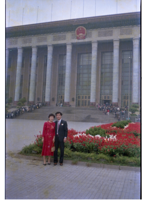 这张照片看着喜气,浓浓的时代感——人民大会堂前拍下的纪念照,爸爸西装笔挺,妈妈穿着鲜艳的红裙子,两个人郑重又幸福地站在一起。