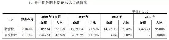 招股书显示,2017年~2019年,“猪猪侠”IP收入分别约为1.45亿元、1.41亿元、1.39亿元,占当年收入的比重分别高达95.00%、70.43%、71.56%,为公司收入贡献最大的 IP。不过可以看到“猪猪侠”的IP收入其实是连年下滑的。