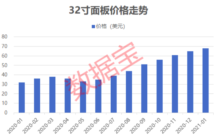 玻璃基板是液晶面板的重要原材料,其价格走势影响面板成本。受玻璃基板供应下降的影响,面板价格从2020年5月开始持续上涨。以32寸面板价格为例,1月最新报价为68美元/片,较去年5月低点33美元/片涨幅超过了100%。其他尺寸的面板也有50-100%左右的涨幅,大尺寸面板供需持续偏紧,预计1~2月份维持约5美金涨幅。
