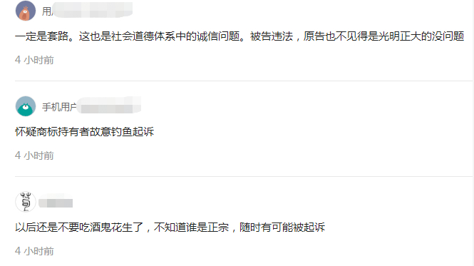 “有人到店点名要买酒鬼花生→店主网上进货酒鬼花生→客人来买酒鬼花生,拍照留证据→起诉零售商店”,有网友质疑这是钓鱼式诉讼,已成为一种产业链。对此说法,该工作人员回应,“什么产业链我不知道,我只回答你一个问题,商标是我们公司的,我们有正当的维权的权利,我们不仅有权起诉超市,也有权起诉生产厂家,我们没有错。”