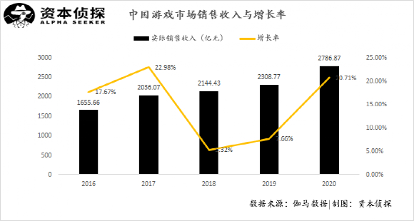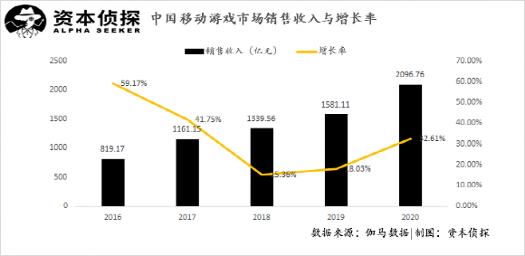 因为在2020年,中国游戏市场实现实际销售收入2786.87亿元,同比增长率20.7%,行业增速出现明显回升:移动游戏市场方面,2020年中国移动游戏市场实际销售收入达2096.76亿元,同比增长32.61%,手游行业景气度进一步提高。