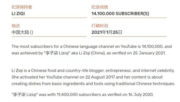 据吉尼斯世界纪录介绍,2020年7月16日,李子柒因1140万的YouTube订阅量被列入《吉尼斯世界纪录大全2021》,成为“最多订阅量的YouTube中文频道”的纪录保持者。六个月过去,李子柒YouTube订阅量已达1410万,刷新了她此前创下的吉尼斯世界记录。