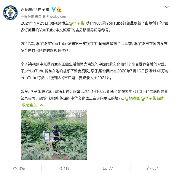2月2日上午消息,吉尼斯世界纪录发文宣布,短视频博主李子柒以1410万的YouTube订阅量刷新了由其创下的“YouTube中文频道最多订阅量”的吉尼斯世界纪录。吉尼斯世界纪录起源于英国,是被公认为全球记录认证的权威机构。