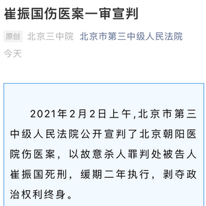 北京市第三中级人民法院微信号最新信息显示,2021年2月2日上午,北京市第三中级人民法院公开宣判了北京朝阳医院伤医案,以故意杀人罪判处被告人崔振国死刑,缓期二年执行,剥夺政治权利终身。