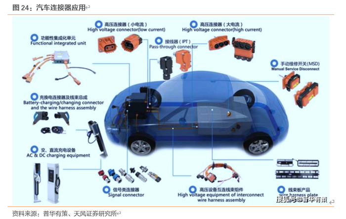 新能源汽车蓬勃发展带来新机会。传统汽车需要用到的电子连接器种类有近百种,单一车型所使用的连接器达到600左右,主要集中应用在发动机管理系统、安全系统、娱乐系统等方面。而相较于传统燃油汽车,新能源汽车电气化程度更高,对连接器的需求量显著增加。传统燃油汽车单车使用低压连接器价值在1,000元左右,而高压连接器的材料成本以及屏蔽、阻燃要求等性能指标高于传统的低压连接器,新能源汽车单车使用连接器价值远高于低压连接器。其中,纯电动乘用车单车使用连接器价值区间为3,000-5,000元,纯电动商用车单车使用连接器价值区间为8,000-10,000元。并且新能源汽车单车使用连接器数量在800到1000个,远高于传统汽车的平均水平。配套充电桩中同样大量使用了连接器产品,且单台新能源汽车充电桩的均价为2万元,而其中连接器的造价大约为3500元,充电桩连接器价值占比较大。