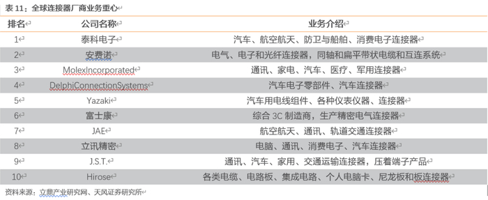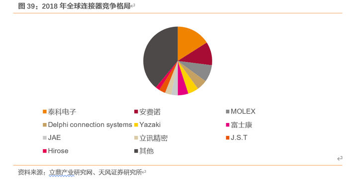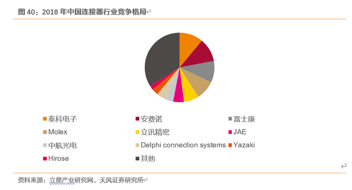 ——我国连接器市场依然被国外企业占据较大份额。全球市场中,泰科电子与安费诺两大国际连接器巨头占据较大份额,占比分别为16%和11%,富士康和立讯精密两家中国企业全球市场排名前10,占比分别为5%和3%;而国内市场中,泰科与安费诺等国外企业依然占据较大份额,国内仅富士康、立讯精密和中航光电三家企业市场份额排名前10。