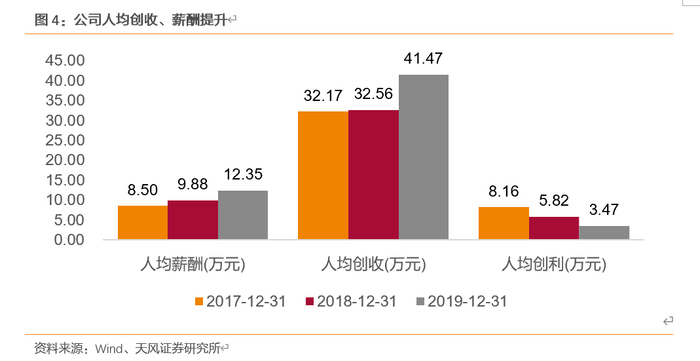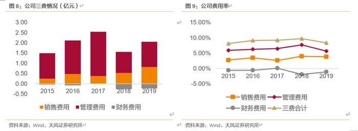 近三年,公司三费合计情况保持稳定,分别为9.21%、9.69%和8.38%,其中管理费用(已剔除研发费用)占比最大,分别为6.47%、7.68%和5.69%。2018年管理费用上升主要因公司员工教育水平和结构实现优化,人均薪酬提高导致管理费用率提升;2019年三费比重下降系营业收入提升,销售费用上升系公司开发新业务营销费用增加且恒赫鼎富首次并表导致。