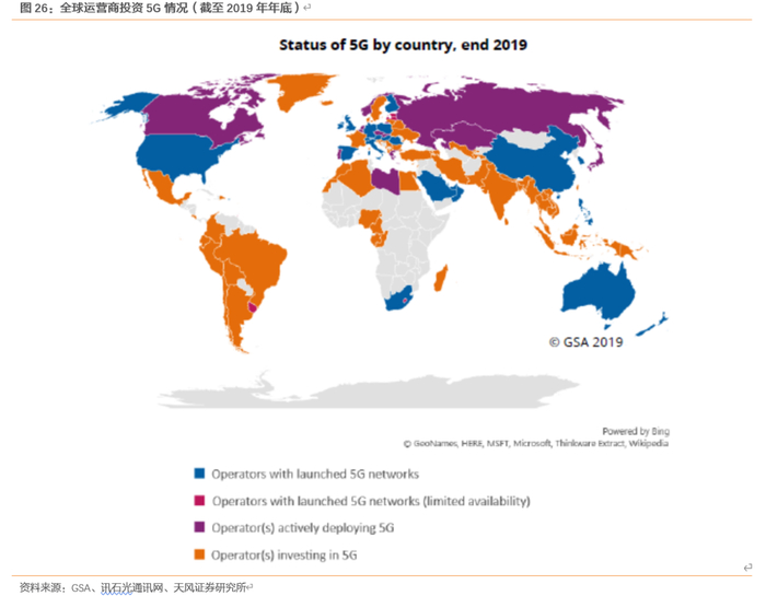 5G投资热潮来临,根据GSA报告,截至2019年底,全球有119个国家/地区的348家运营商正在进行5G投资,其投资的形式包括测试/试用、获得牌照、部署网络和启动服务。77家运营商宣布已在其网络中部署了符合3GPP要求的5G技术。
