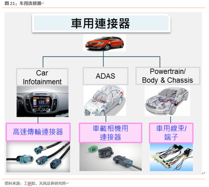 近年来汽车电子高歌猛进,市场规模不断扩大,2007年-2017年,汽车电子成本占整车成本比例从约20%上升至40%左右,2020年达到50%,预计到2030年汽车子产品占整车成本的比例将达到75%以上。随之而来,汽车连接器的市场需求不断增长,在车联网、智慧电动车等潮流推动下,消费者对汽车在安全、娱乐等方面需求增长,衍生出高速传输连接器、车载相机用连接器、车用线束/端子三大市场成长驱动诱因,特别是未来汽车ADAS(自动驾驶辅助系统)整合愈来愈多影像感测模组与镜头,也刺激出更多模组连接器的需求,另外因汽车电子化趋势,车内控制回路日趋复杂,也进一步带动更多车用线束/端子之连接器产品需求,为车用连接器带来更大的市场成长潜力。