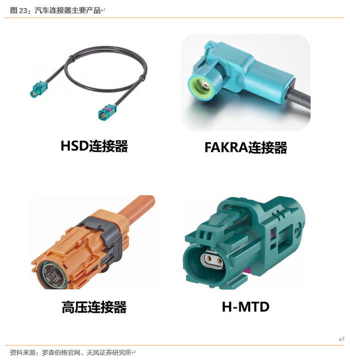 汽车连接器产品主要包括HSD连接器、FARKA连接器、高压连接器以及H-MTD连接系统等。HSD连接系统是一种用于低压差分信号的高性能、高屏蔽数据系统,特性阻抗是100Ω,使用屏蔽双绞线。HSD专为汽车市场而设计,可用在如LVDS摄像头、USB和IEEE1394等应用上,可满足多种需求。FAKRA连接器源自罗森伯格,经过二十余年的发展,FAKRA已成为汽车行业通用的标准射频连接器,被业界广泛应用。随着近几年汽车技术的飞速发展,越来越多有助于提高驾驶与乘坐舒适性的智能功能被应用到汽车中,并且经历了从用于高端汽车到标配日常家用级汽车的过程。H-MTD连接器是360°全屏蔽系统,经过试验验证,相较于市场上两点屏蔽的同类型连接器,H-MTD屏蔽衰减性能更优秀,屏蔽效果至少是其它两点屏蔽连接器的1000倍。高压连接器主要使用在新能源汽车高压大电流回路,和导电线缆同时作用,将电池包的能量通过不同的电气回路,输送到整车系统中各部件,如电池包、电机控制器、DCDC转换器、充电机等车身用电单元。