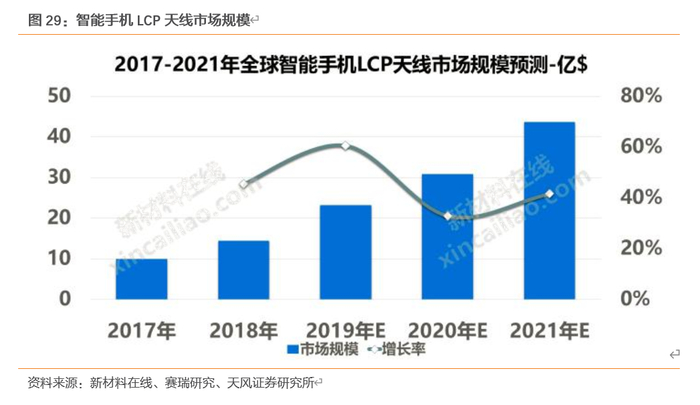从价值量来看,苹果在其IPHONE X系列产品中已经采用了LCP天线,而2019年iPhone X 中使用的 LCP 天线的单价约为8-10美金,而LDS 天线(基板为塑胶、玻璃等)仅为LCP天线的一半,PI天线仅为0.4美金,可得从PI天线到LCP天线单机价格提升约20倍。