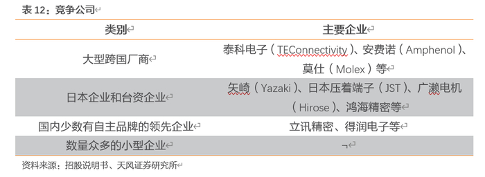 目前国内参与连接器竞争的企业主要包括四类:一类是以泰科电子(TEConnectivity)、安费诺(Amphenol)、莫仕(Molex)等为代表的大型跨国连接器厂商,技术水平较高、产品性能优越,具备较强竞争力。第二类是以矢崎(Yazaki)、日本压着端子(JST)、广濑电机(Hirose)等为代表的日本企业和以鸿海精密为代表的台资企业,其连接器产品在电脑及外设等个别应用领域的市场优势较为明显。第三类是以立讯精密、得润电子、公司为代表的研发技术水平、产销规模等方面居于国内领先的少数自主品牌厂商,其连接器产品在智能手机、平板电脑、家用电器等细分下游产品的应用领域占据一定竞争优势。最后是数量众多、技术水平相对落后、规模较小的连接器生产企业,产品同质化现象较为严重,也面临着较为激烈的市场竞争。