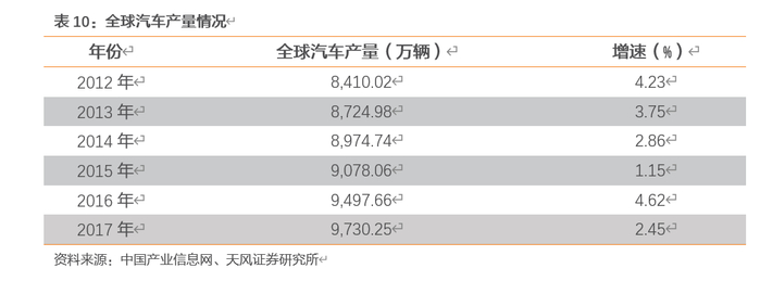 在中国汽车市场持续繁荣的拉动下,全球汽车产量实现了稳步增长。2012-2017年全球产量由8,410.02万辆增长至9,030.25万辆,年均复合增长率分别为1.43%。目前中国等发展中国家人均汽车拥有量与发达国家相比仍存在较大差距,因此未来全球汽车市场仍存在广阔的发展空间。预计2020年全球汽车产量将超过1.1亿辆,其中中国汽车产量则将达到3,000万辆。