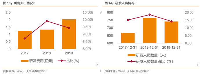研发构筑技术优势,创新驱动企业成长。2017-2019年,公司大力支持自主研发,研发费用稳步提升。从研发支出和员工结构方面,都加大了投入和优化。公司研发费用占比由5.52%增加至9.45%,研发人员由668人增长至742人。