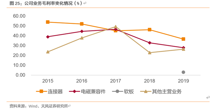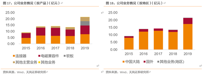 品类扩张,多领域贡献营收。2015-2018年,公司营收主要贡献为连接器和电磁兼容件,加总占比超过80%。其他电子元器件近几年占比逐渐增加,2019年末增加至14.90%,该业务主要包含BTB连接器、汽车连接器以及天线和非射频连接器类产品。公司开发出的射频BTB产品已出合格产品,并批量用于核心客户,取得了较好的市场反映;汽车连接器及天线的出货量也在不断提升;非射频连接器类业务方面,公司控股子公司恒赫鼎富(苏州)电子尚处在资本支出投入、规模逐渐扩大,正积极推动申请导入。同时,公司通过外延收购布局柔性线路板,其2019年收入占比16.38%。